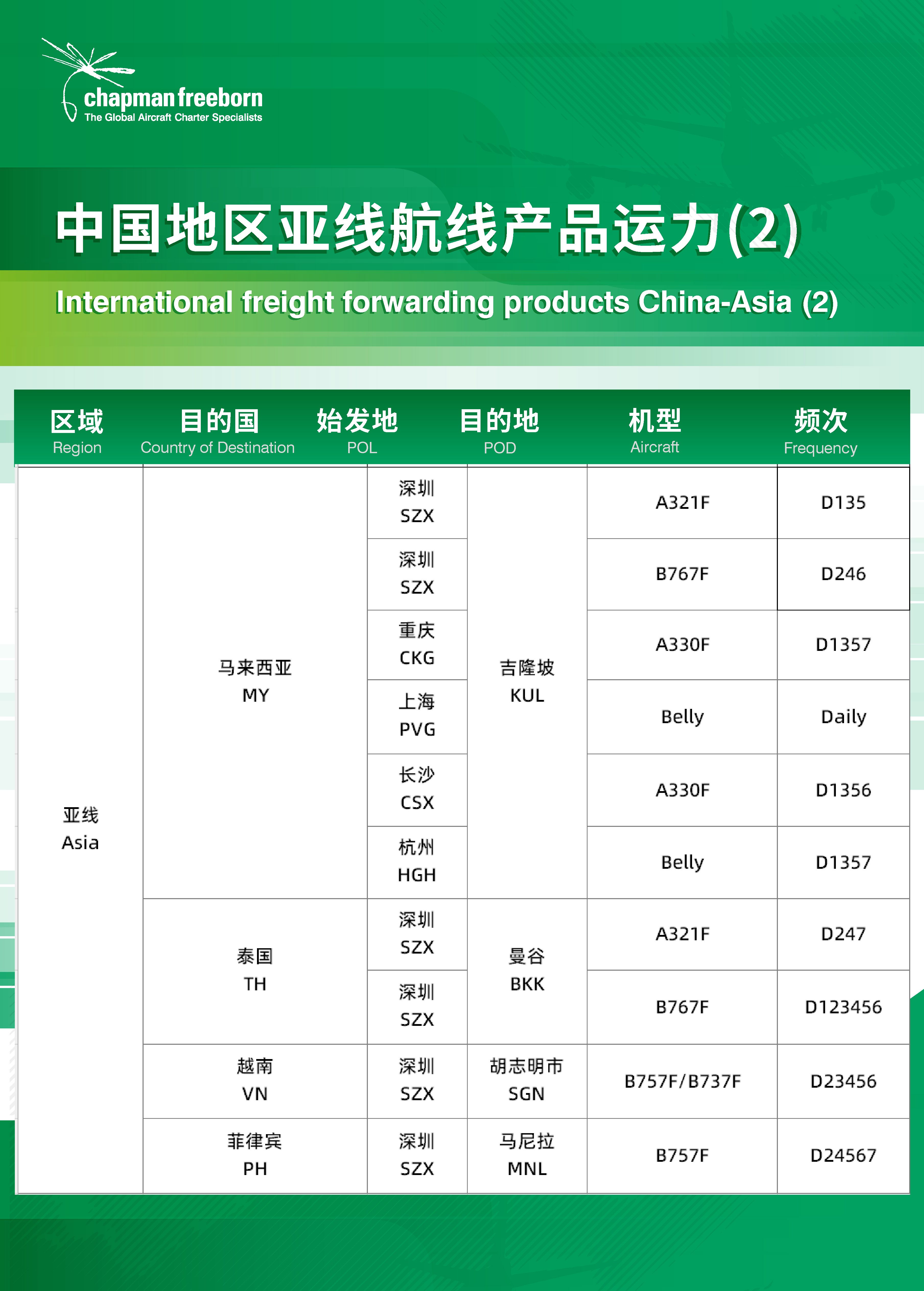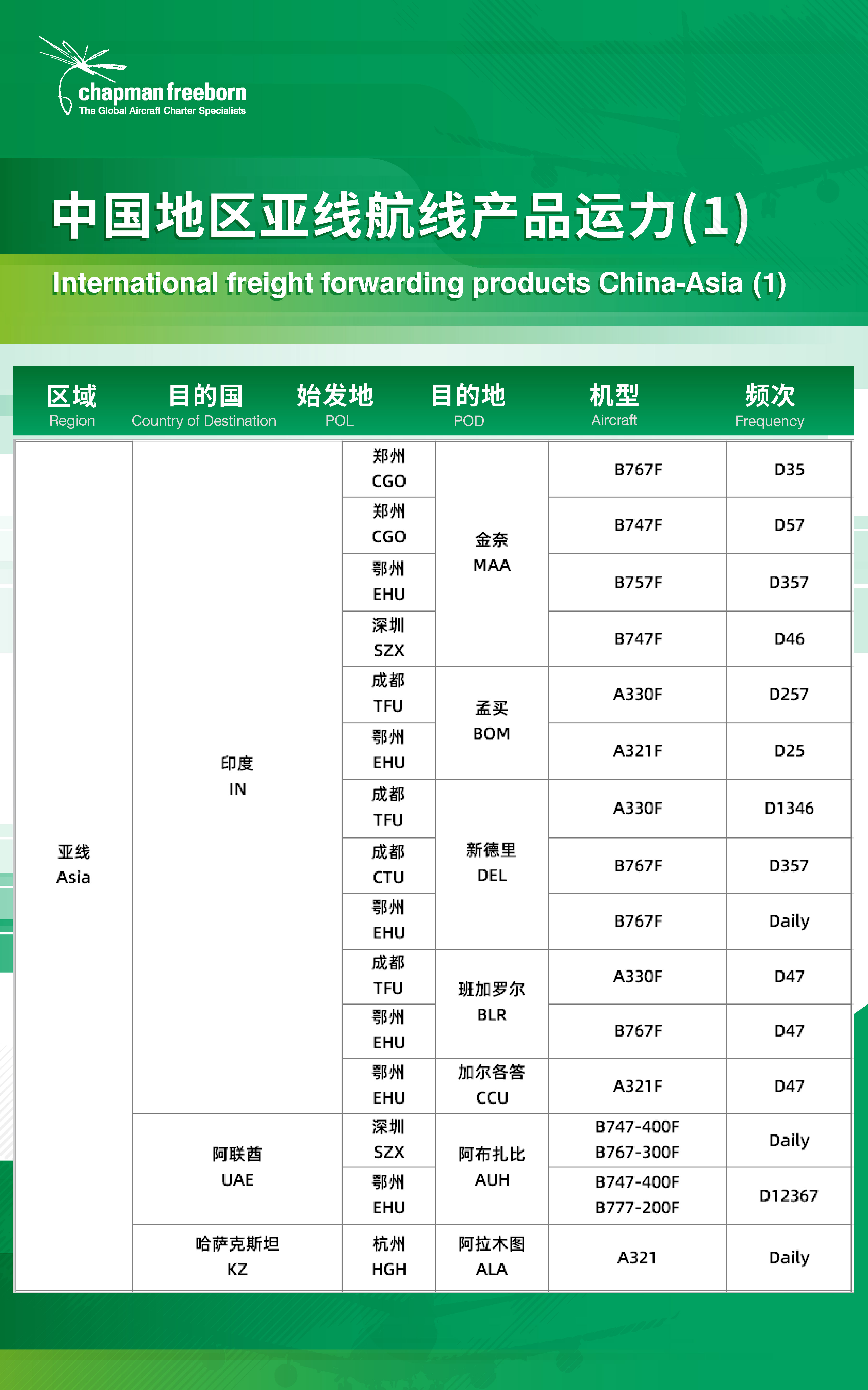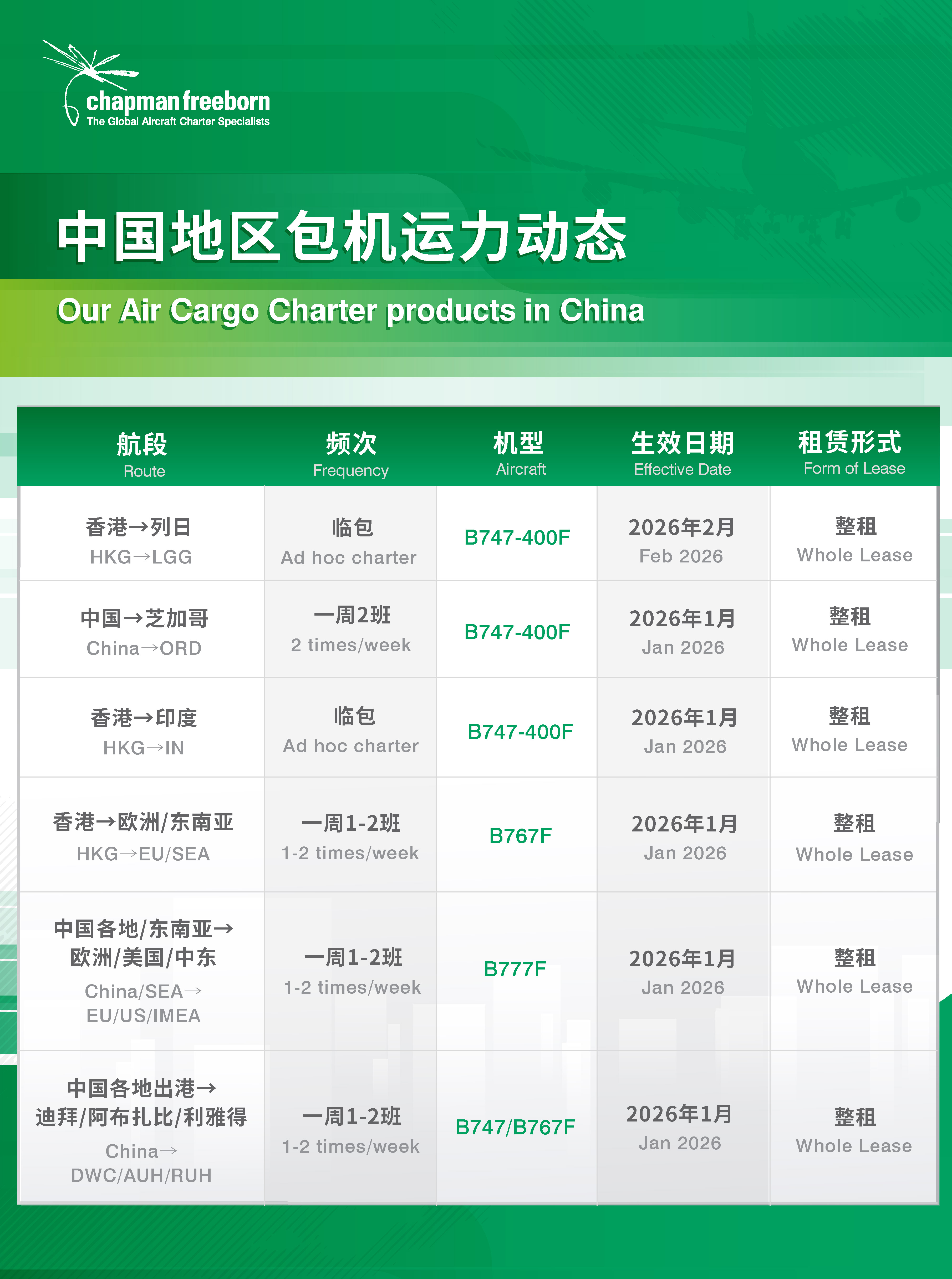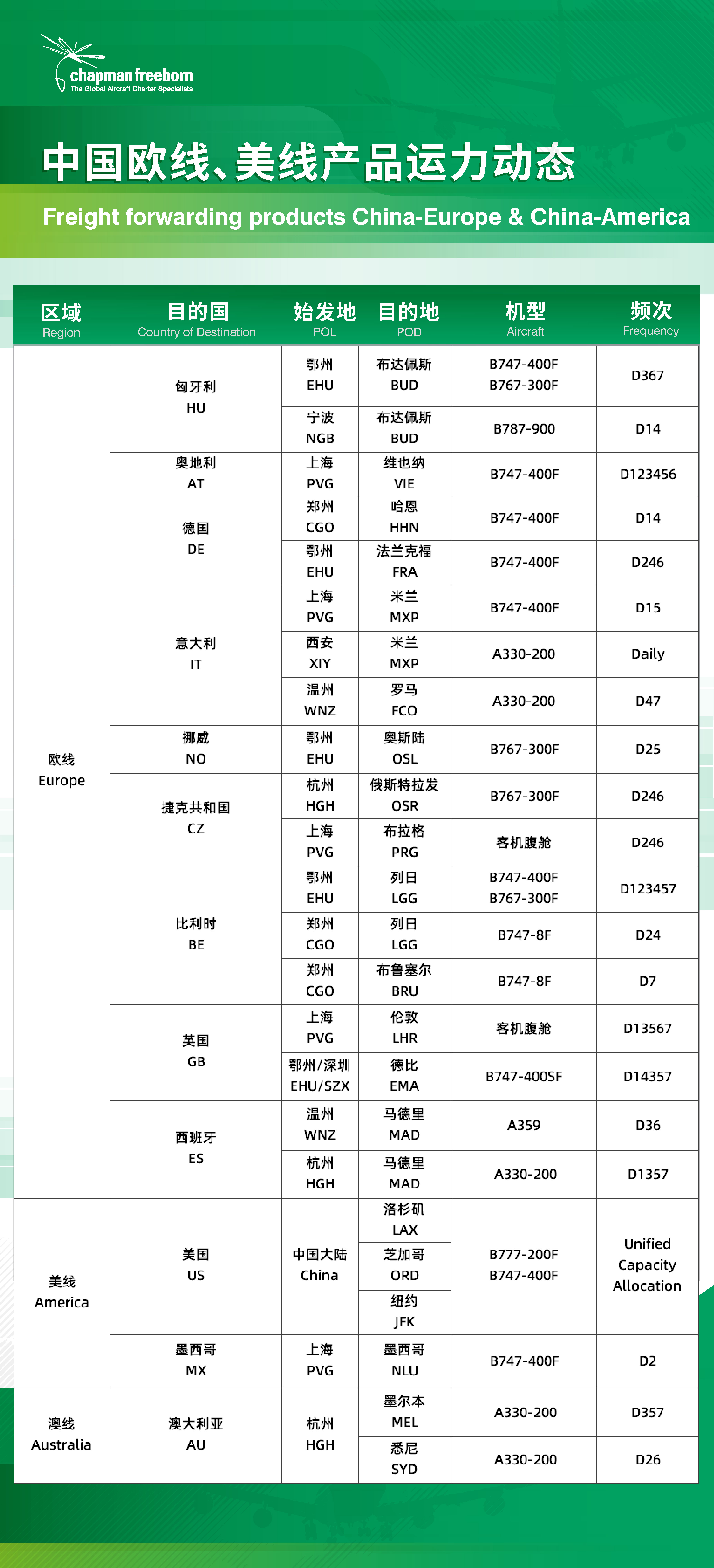 如果您有其他航線產品預定或整包/半包需求,無論是緊急貨物還是在計劃中的運輸,歡迎通過郵箱china@chapmanfreeborn.aero或撥打24小時貨運熱線+86 21 52861816與我們聯絡,獲取最新報價。