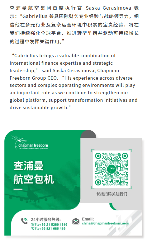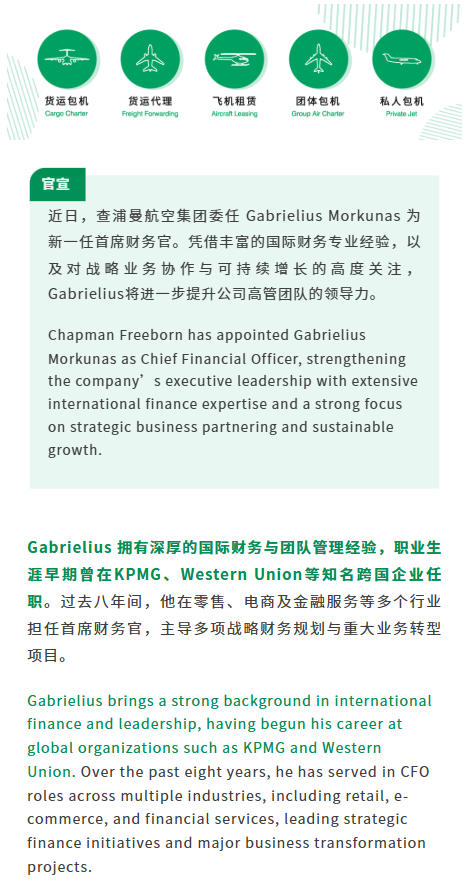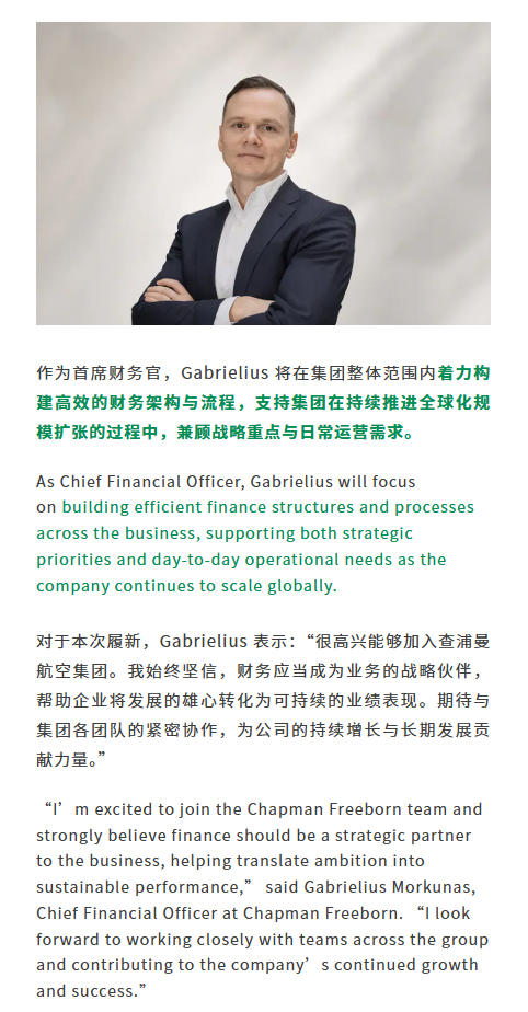 官宣 | 查浦曼航空集團委任 Gabrielius Morkunas 為新一任首席財務官