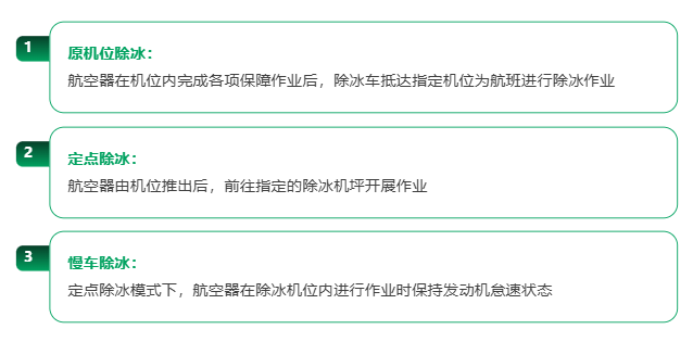 除冰方式的選擇與機場要求和天氣情況相關(guān)。除部分私人飛機使用加溫機庫除冰外,常用的航空器除冰方式一般分為原機位除冰與定點除冰兩種。以首都機場為例,在結(jié)霜、零星小雪、雪后三種天氣條件下,除冰保障模式一般為原機位除冰,降雪中則一般采用定點慢車除冰。如遇天氣情況復(fù)雜或處于特殊保障任務(wù)期間,除冰模式將通過運管委協(xié)調(diào)機制商定。